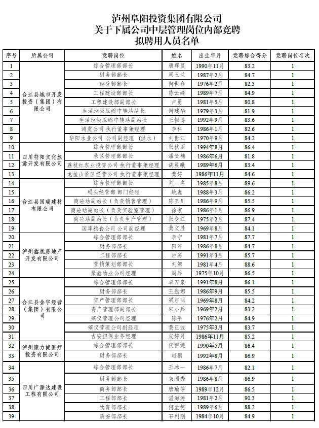 根據(jù)《瀘州阜陽投資集團(tuán)有限公司關(guān)于下屬公司中層管理崗位內(nèi)部競聘工作的公告》(瀘阜投發(fā)〔2020〕21號)的規(guī)定,經(jīng)阜陽集團(tuán)黨委會研究決定,擬聘用唐琿蔓等39人為瀘州阜陽投資集團(tuán)有限公司下屬公司中層管理人員?,F(xiàn)面向社會公示7日,公示時間2020年6月19日至2020年6月25日。公示期間,如有問題,請及時向?yàn)o州阜陽投資集團(tuán)有限公司組織與人力資源管理部反映。要求舉報者署實(shí)名,實(shí)事求是地反映問題,并提供必要的調(diào)查線索。