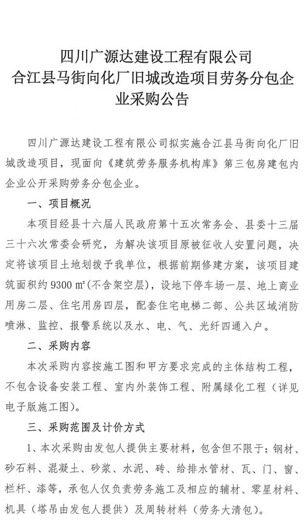四川廣源達建設(shè)工程有限公司 合江縣馬街向化廠舊城改造項目勞務(wù)分包企業(yè)采購公告.doc