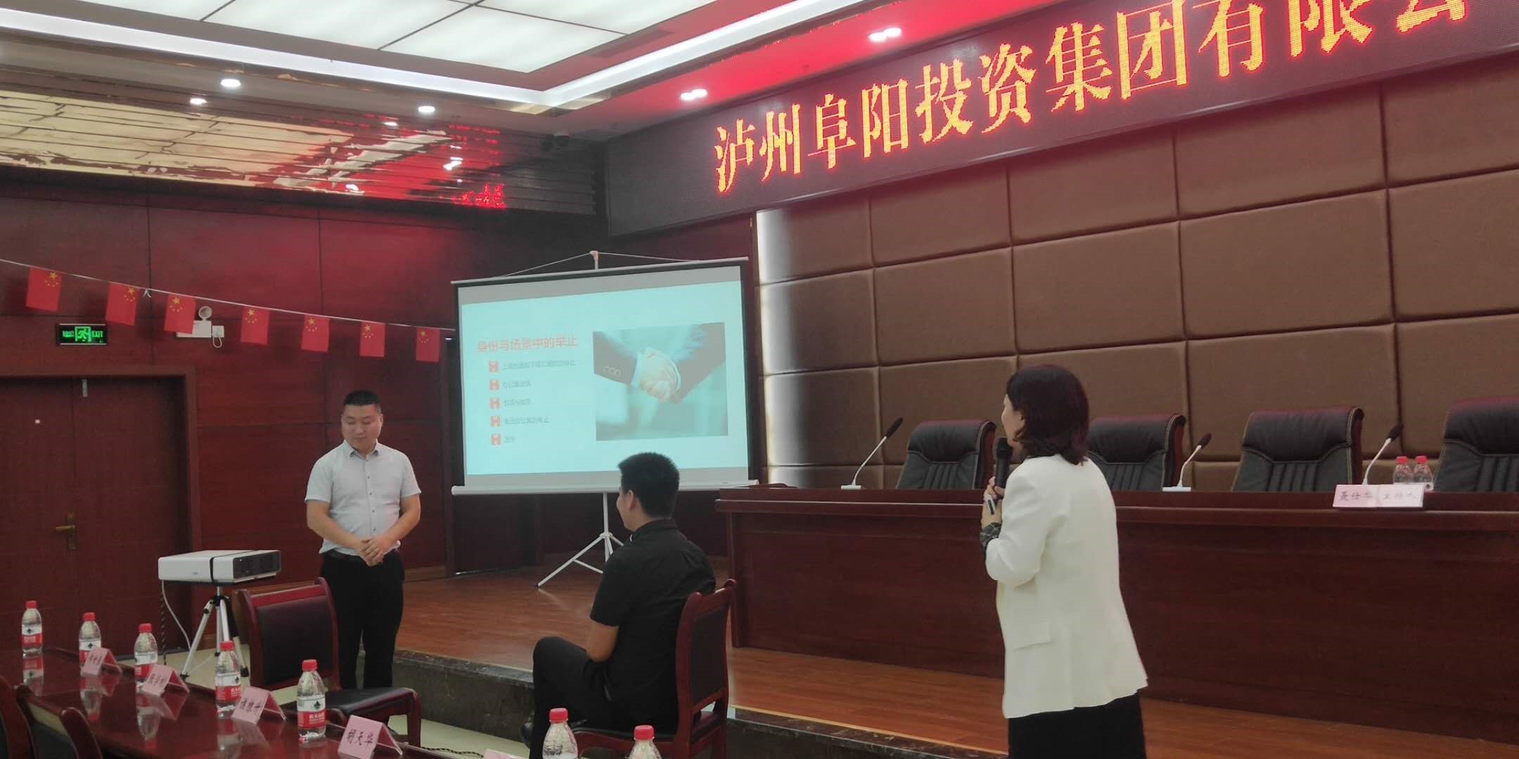 為提高集團(tuán)員工的職業(yè)素質(zhì),樹立良好的企業(yè)形象。5月26日下午,阜陽集團(tuán)組織各公司辦公室、后勤、銷售、黨建、人力資源等崗位工作人員70余人開展商務(wù)禮儀培訓(xùn)。培訓(xùn)由瀘州職業(yè)技術(shù)學(xué)院高級講師、高級商務(wù)禮儀培訓(xùn)師劉利亞主講。
