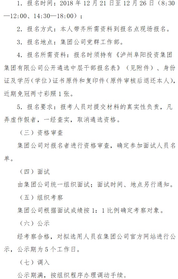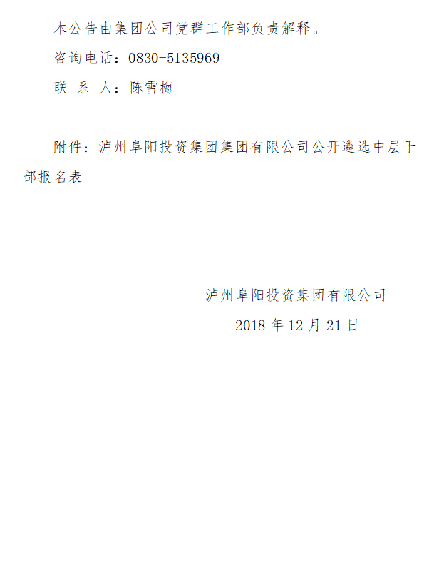 瀘州阜陽(yáng)投資集團(tuán)集團(tuán)有限公司關(guān)于面向全集團(tuán)公開(kāi)遴選中層干部的公告