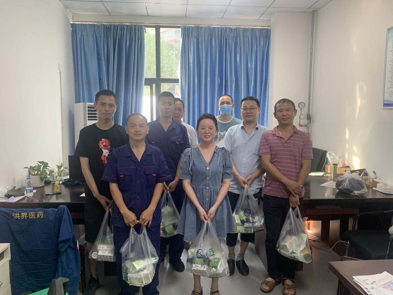 2022 年 7 月 8 日, 瀘州康力健醫(yī)療投資有限公司下屬公 司 四 川 洪 昇 醫(yī) 藥 有 限 公 司 組 織 開 展 “ 夏 日 送 清 涼 ” 活 動 , 工 會 主 席 周 容 帶 領(lǐng) 工 作 人 員 慰 問 奮 戰(zhàn) 在 高 溫 一 線 的 廣 大 干 部 職 工 , 為 他 們 送 去 了 藿 香 正 氣 液 、 風(fēng) 油 精 、 十 滴 水 、 夏 桑菊等防暑降溫物資。