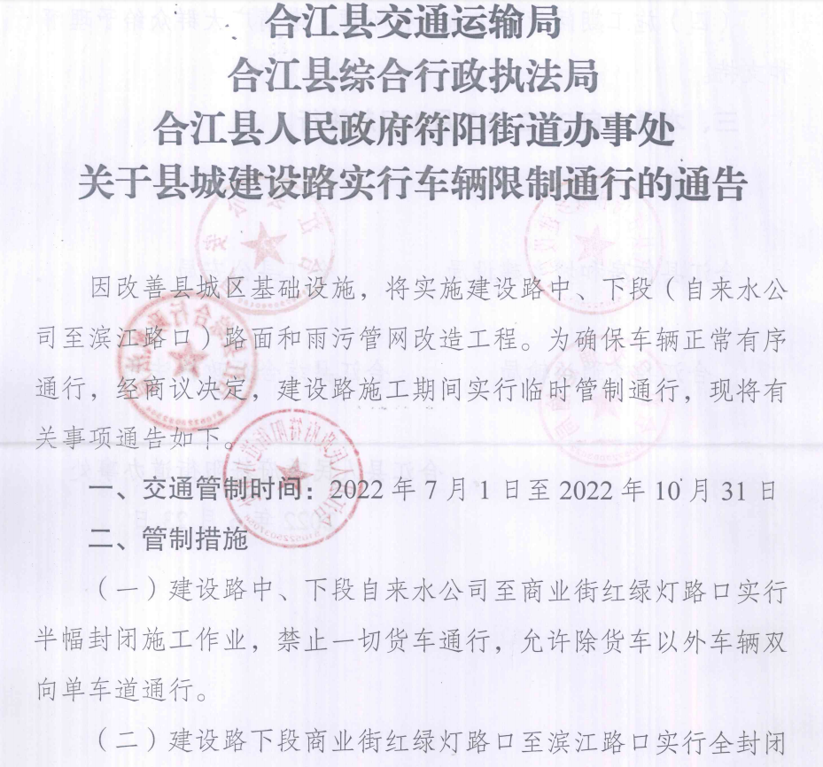關(guān)于縣城建設(shè)路實(shí)行車輛限制通行的通告
