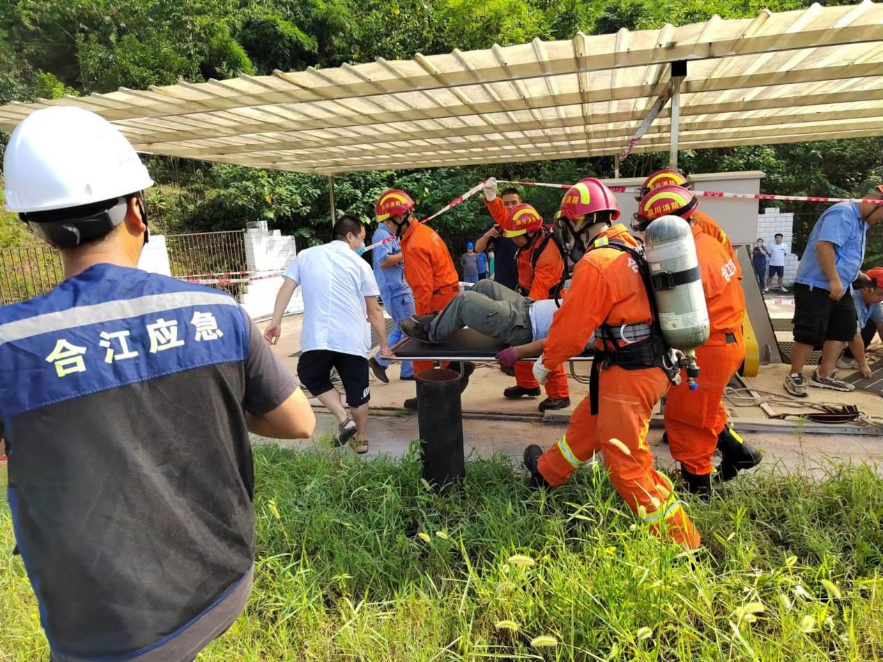 2022 年 8 月 5 日, 白沙鎮(zhèn)人民政府、 江北消防中隊、 白沙衛(wèi)生院和瀘州匯鑫環(huán)??萍加邢薰韭?lián)合在白沙鎮(zhèn)城市生活污水處理廠開展有限空間作業(yè)應(yīng)急演練, 白沙鎮(zhèn)副鎮(zhèn)長周雪蓮、 安辦主任牟葉奎、 江北消防中隊指導(dǎo)員王小峰、 匯 鑫公司副經(jīng)理劉可參加了本次演練。