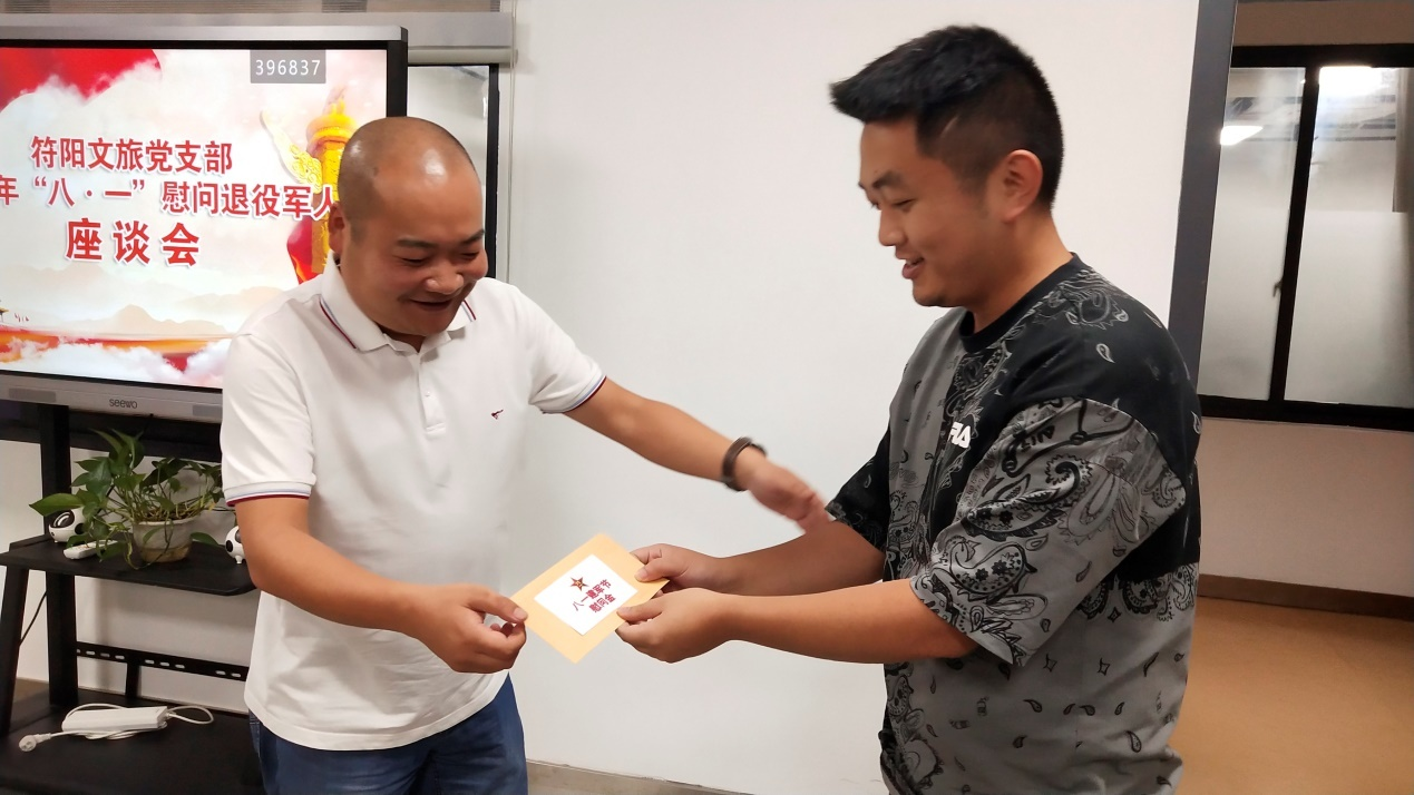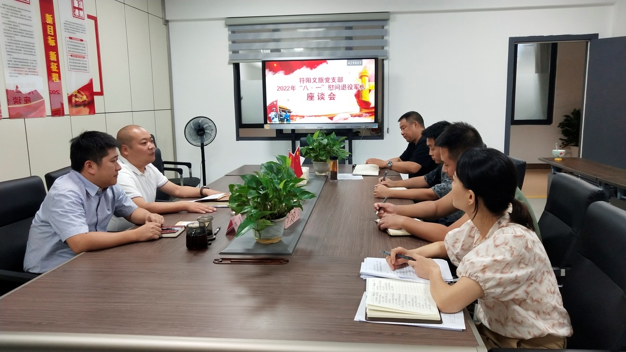 為扎實(shí)做好擁軍優(yōu)屬 、 擁政愛民工作 , 在 “ 八 一 ” 建軍節(jié)來臨之際, 符陽文旅黨支部開展 “ 八一 ” 慰問活動(dòng), 組織文旅 公司工作的退役軍人召開座談會(huì), 了解他們的工作和生活情 況, 為他們送上慰問金, 并致以節(jié)日的祝福。 退役軍人表示 感受到公司的關(guān)懷和愛心,在今后的工作中發(fā)揮軍人本色, 為公司發(fā)展貢獻(xiàn)力量。