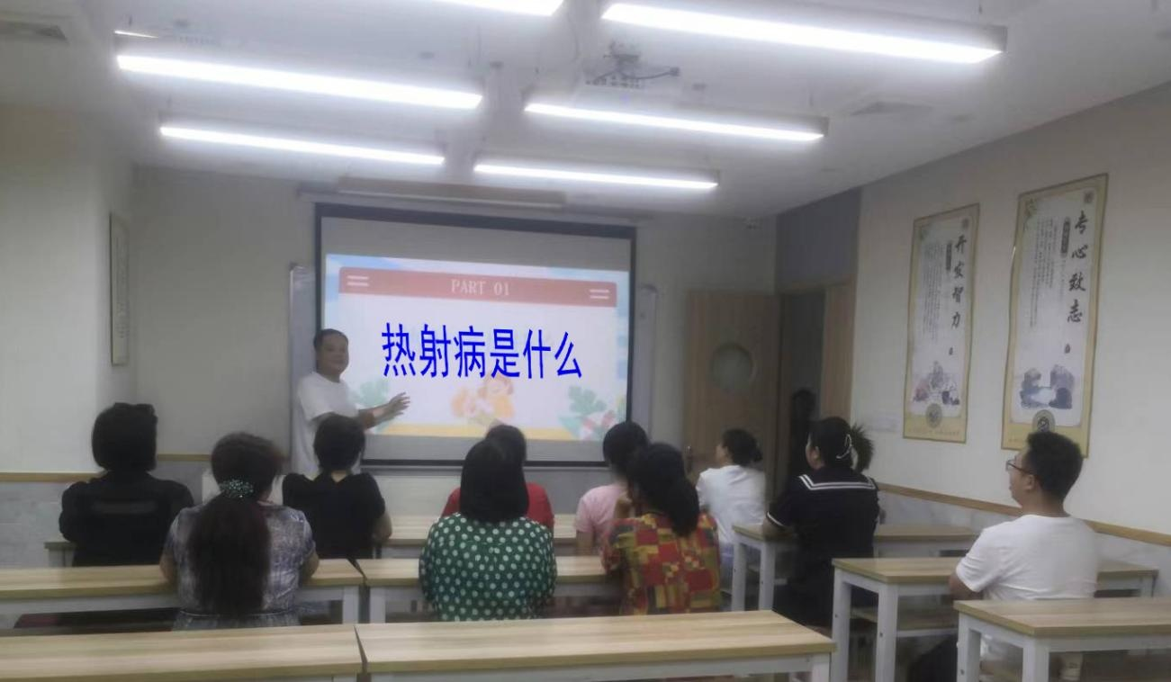 全體員工一起學(xué)習(xí)熱射病的各種防范措施并進(jìn)行熱射病的急救演練。 提高大家預(yù)防熱射病的意識, 筑牢全校師生的健 康和安全防范屏障,為暑期課程撐起夏日“保護(hù)傘”。